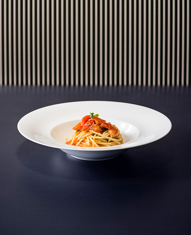Мягкие на ощупь и слегка переливающиеся стены, монументальный камин из зеленого мрамора, текстильные панели Armani/Casa с мотивами тропических пальм — в этом окружении посетители найдут меню из тщательно продуманных блюд средиземноморской и северной итальянской кухни: спагетти с помидорами с острова Вулкано и домашнюю пасту Scialatielli с кальмарами.