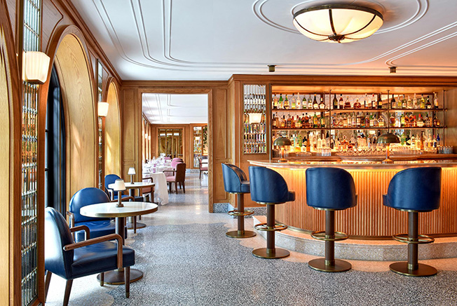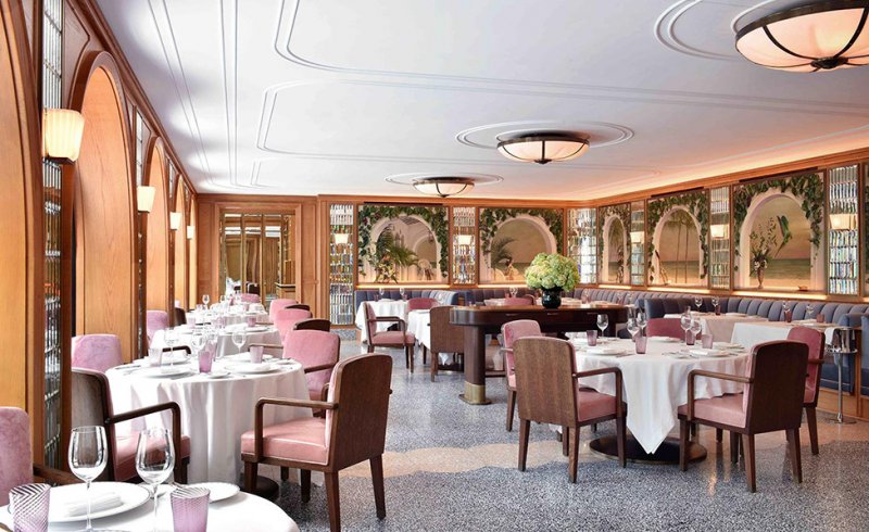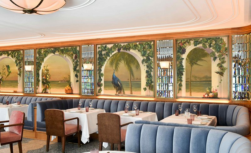 Классическая обстановка ресторана, спроектированная Martin Brudnizki Design Studio, богата и изысканна. Здесь развешены люстры в стиле ар-деко, н астенах — росписи ручной работы, выполненной британским художником Гарри Миаттом.