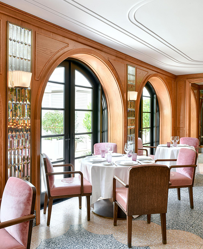 Бар ресторана мягко вписывается в основное пространство, таким образом, сохраняя открытую, но интимную атмосферу, которая продолжается в зоне столовой. Кожаные банкетки, привлекательные полы из терраццо, зеркальные стеклянные детали и обивка в пастельных тонах — все способствует ощущению комфортной роскоши. Открытая терраса обильно засажена местными растениями и утопает в зеленой листве.