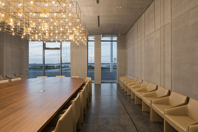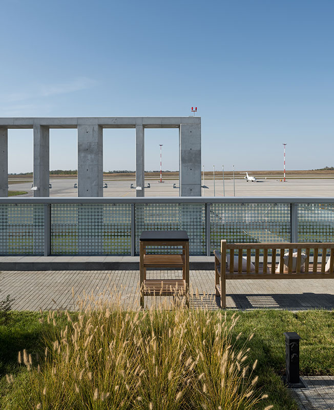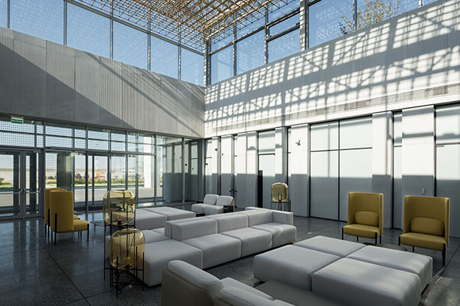 Из зоны прилета с атриумом можно подняться с помощью лифта в сад на кровле. Отдельная зона официальных лиц и делегаций оборудована большим залом заседаний, здесь также предусмотрен кабинет губернатора.