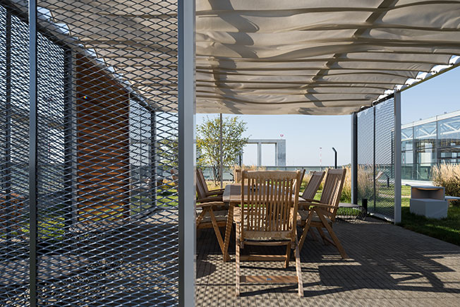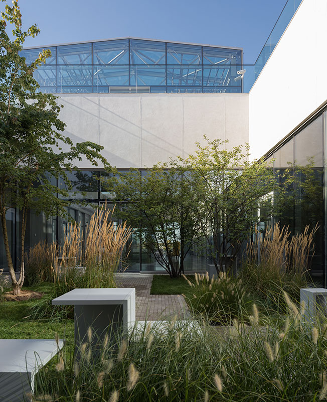 За наружной колоннадой находится стеклянный параллелограмм. В центре объема расположен внутренний двор с лестницей, ведущей на эксплуатируемую кровлю. Здесь расположена открытая площадка с садом, шезлонгами, беседками и баром. Таким образом архитекторы связали воедино интерьер и экстерьер — одно пространство плавно перетекает в другое.