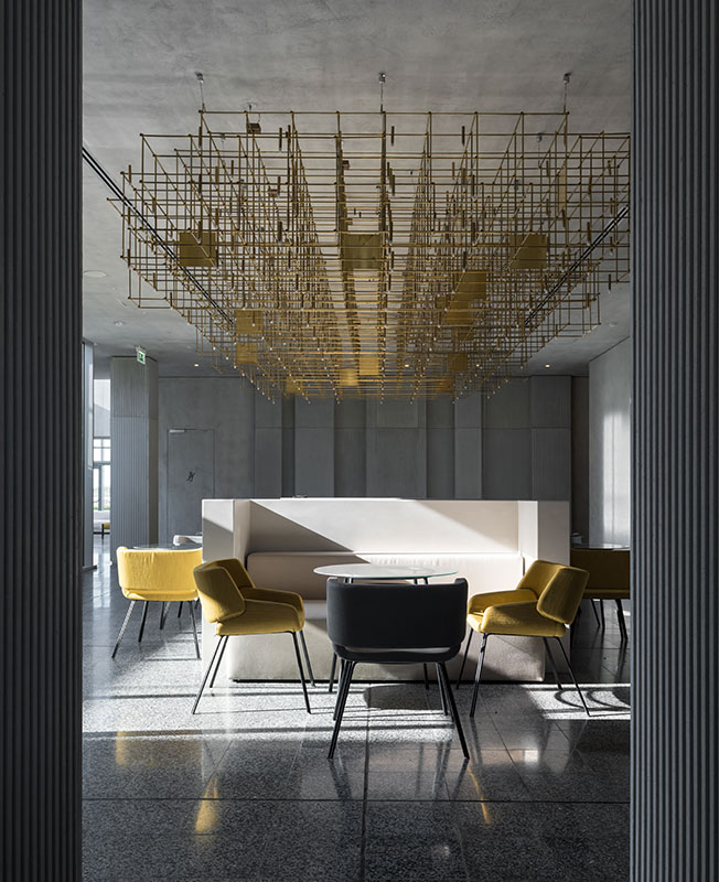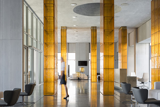 Латунные светильники, а также стеклянные колонны во входном холле — яркий запоминающийся акцент был создан совместно с партнерами Nickel Collective. Блоки мурманского венецианского стекла смонтированы на натянутых тросах и оборудованы интегрированной подсветкой.