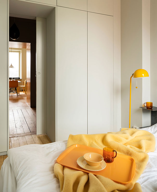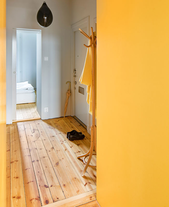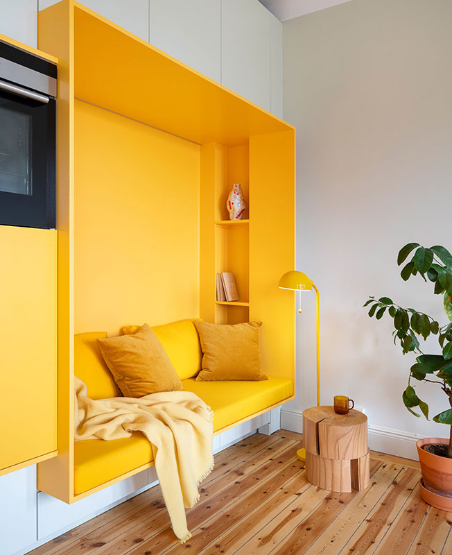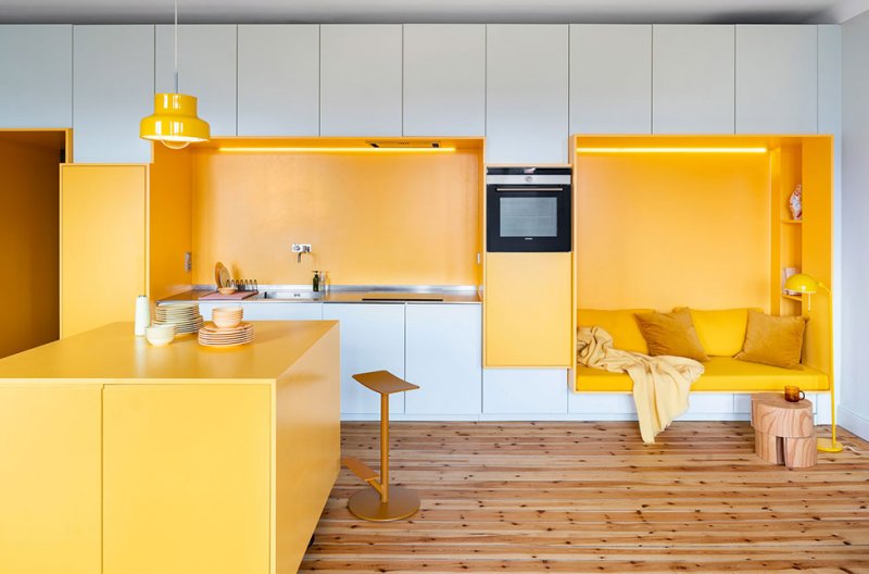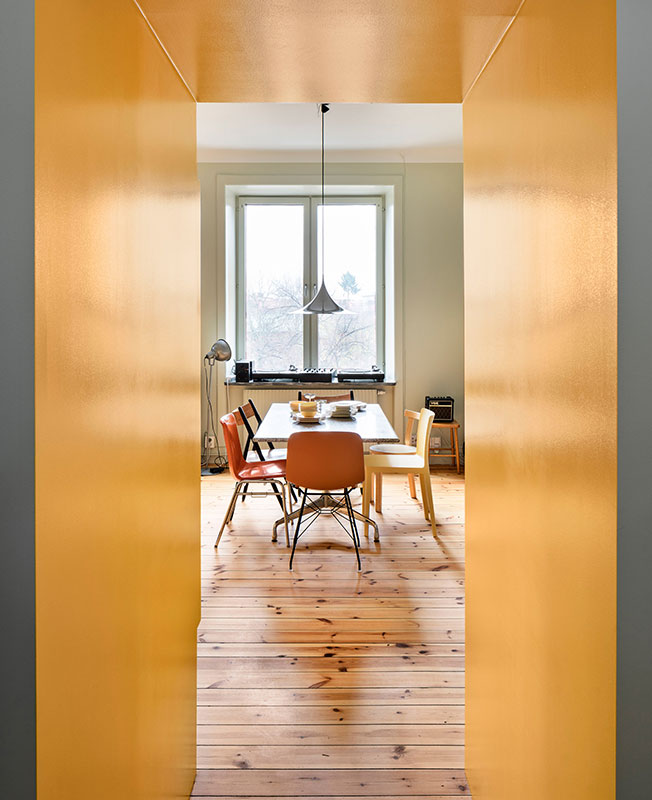 Шведская студия Lookofsky Architecture создала необычную для Стокгольма квартиру c яркими цветными акцентами. Жилье площадью 80 кв. метров с одной спальней принадлежит молодой паре. В последний раз здесь был сделан ремонт в 1970 году. Стараниями архитекторов Lookofsky Architecture старые стены приобрели колорит и много функционального пространства для хранения. Основой интерьера стали цветные складные конструкции, специально разработанные для этой квартиры. Расположенные в разных частях квартиры, они незаметно вписываются в окружающие элементы планировки. Архитекторы установили стену длиной 7 метров со скрытым хранением на кухне, зону для хранения в спальне и конструкции из желтых шкафов в ванной комнате. Шкафы в гостиной и кухне открытой планировки обрамляют ярко-желтую утопленную гостиную и кухонную столешницу, а в ванной комнате - раму для раковины и унитаз. В спальне шкафы расположены вокруг дверной коробки. Продолжение цветовой композиции прослеживается в выборе мебели, а также во встроенных желтых панелях в разных частях комнат и межкомнатных проемах. Это дает новую жизнь пространству и создает основу для социальных взаимодействий и повседневной жизни.