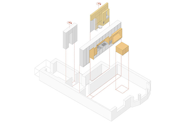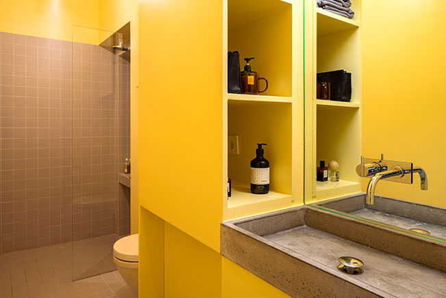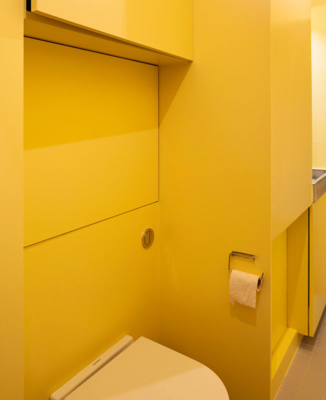 Архитекторы установили стену длиной 7 метров со скрытым хранением на кухне, зону для хранения в спальне и конструкции из желтых шкафов в ванной комнате.