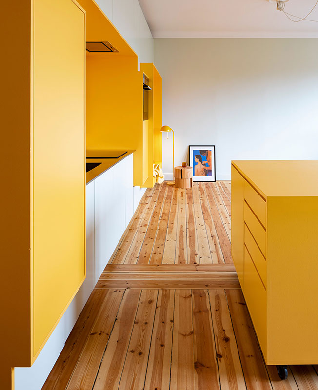 Продолжение цветовой композиции прослеживается в выборе мебели, а также во встроенных желтых панелях в разных частях комнат и межкомнатных проемах. Это дает новую жизнь пространству и создает основу для социальных взаимодействий и повседневной жизни.
