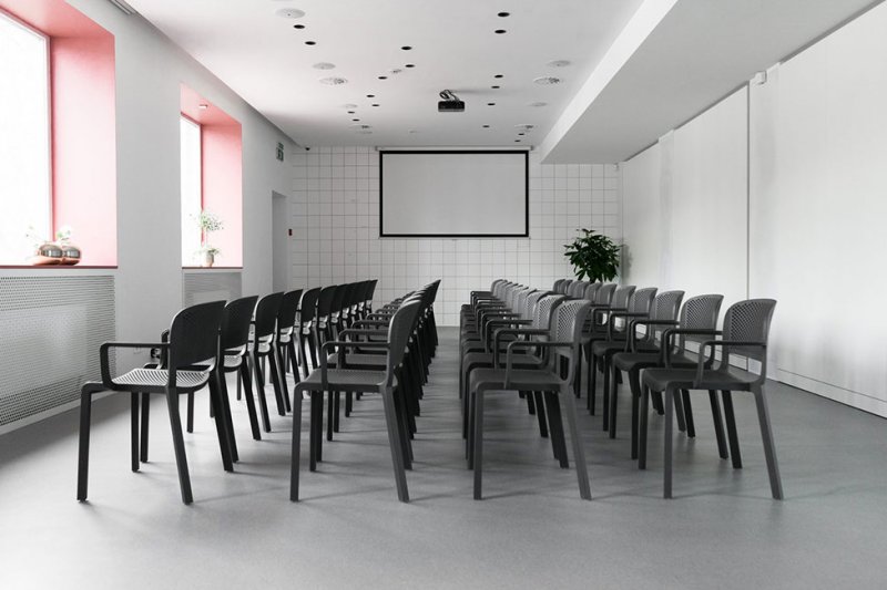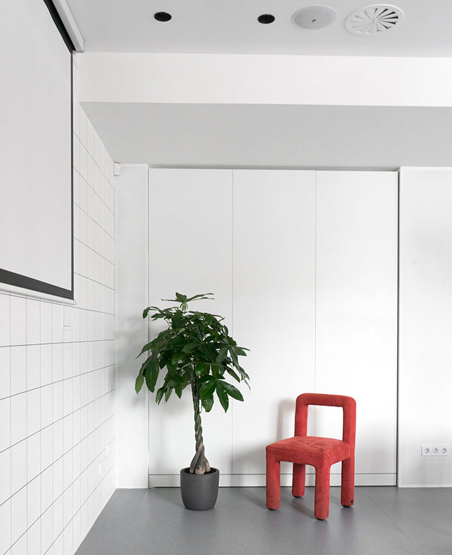 Перед дизайнером стояла задача создать интерьер-трансформер, который позволил бы легко менять пространство под разные задачи и функции: лекционный зал, коворкинг, выставочная галерея.