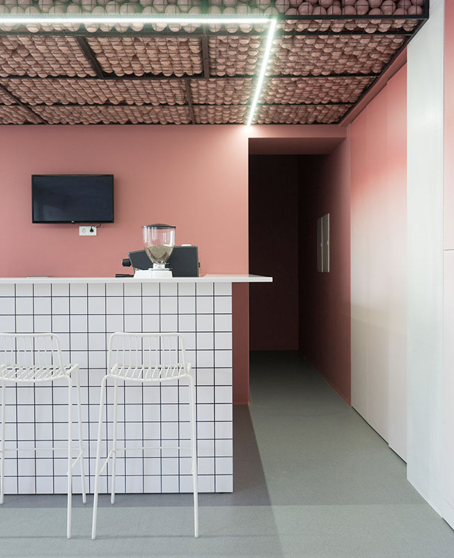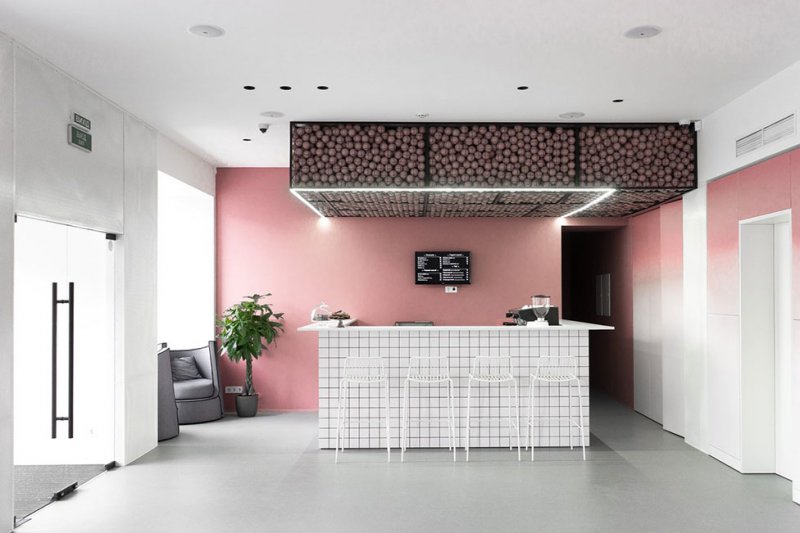В городе Буча, в 30 километрах от Киева появилось нетипичное пространство — образовательный центр Portal по дизайну Виктории Якуши. Интерьер площадью 200 кв. метров минималистичен до аскетизма. Перед дизайнером стояла задача создать интерьер-трансформер, который позволил бы легко менять пространство под разные задачи и функции: лекционный зал, коворкинг, выставочная галерея. nonehttps://www.instagram.com/yakusha.design/https://www.facebook.com/yakusha.designhttp://eng.yakusha.com.ua/ Решением стали мобильные шкафы, которые делят один большой зал на два маленьких. У входа расположено компактное кафе, над барной стойкой которого находится железная клетка с сотнями шариков. Акцентом лаконичного помещения стали терракотовые стулья Toptun и уютные кресла-коконы Lono украинской марки Faina (основатель — Виктория Якуша). Завершают образ невесомые розовые панели, окрашенные градиентом и словно растворяющиеся в пространстве.