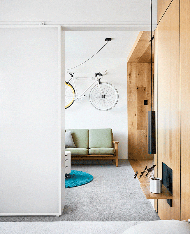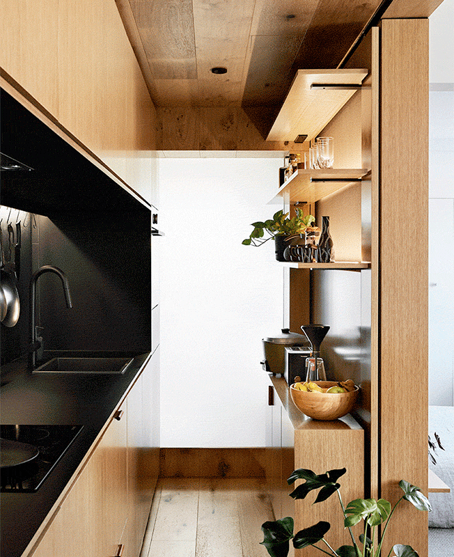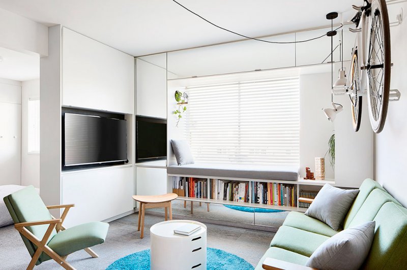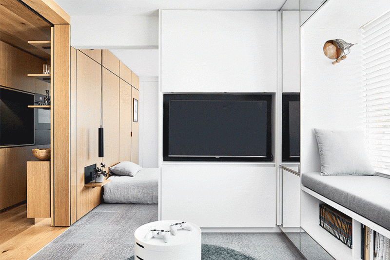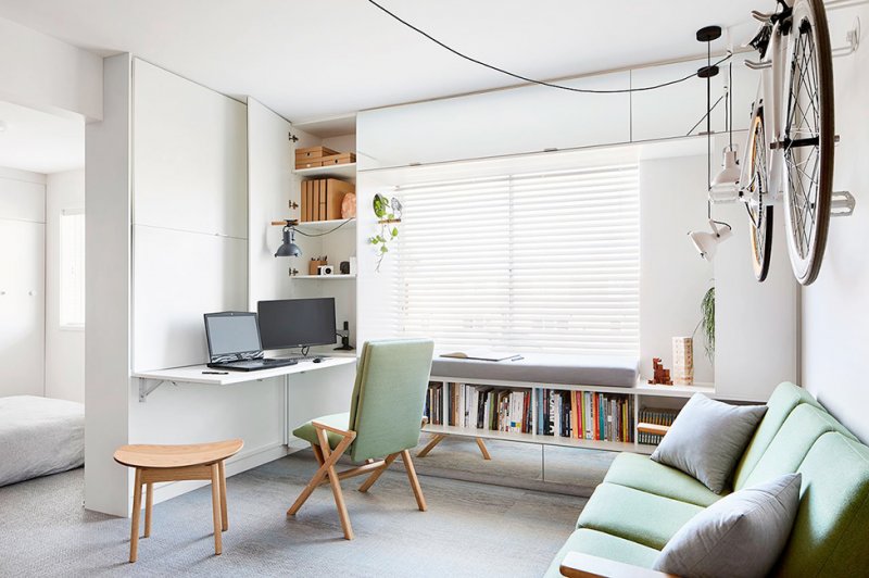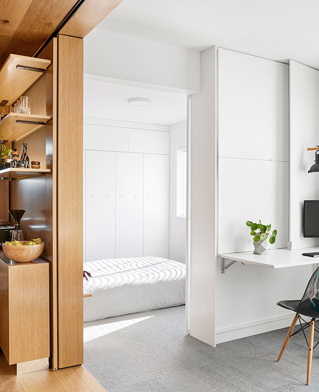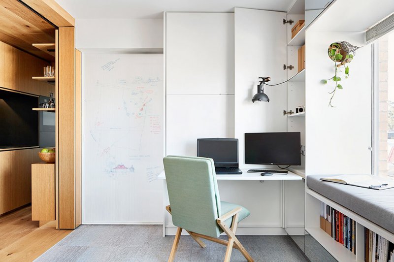 Архитектор Джек Чен, бюро Tsai Design, отремонтировал свою компактную квартиру в доме 1970-х годов в Мельбурне. И постарался ответить на вопрос: «Как разместить большой дом в маленьком пространстве?» Типовая квартира площадью 35 кв. метров с одной спальней вместила в себя пространство для развлечений, домашний офис, место отдыха и удобную кухню. По словам дизайнера, секрет в том, чтобы знать, «где стоит действовать щедро». И, конечно, в многофункциональной мебели. Для этого интерьера команда Tsai Design разработала две модели, способные решать сразу несколько задач: выдвижную панель с обеденным столом и складную рабочую станцию, которые легко исчезают при необходимости. Подобные многофункциональные системы, а также вместительные встроенные шкафы, где хранятся все вещи, были реализованы с помощью профессионального столяра-краснодеревщика, который специализируется на отелях высокого класса. Визуально квартира разделена на две зоны: зоны обслуживания, в которых преобладает отделка деревом, и жилые помещения, окрашенные в белый цвет. Такое решение позволяет зоне кухни и прихожей восприниматься, как отдельное пространство, независимое от полностью белой гостиной, несмотря на отсутствие между ними стен.