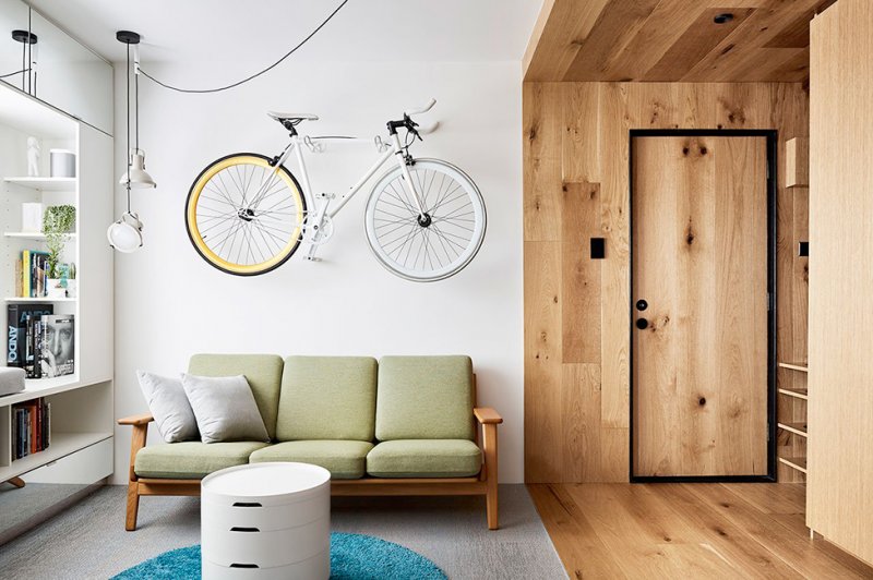 Визуально квартира разделена на две зоны: зоны обслуживания, в которых преобладает отделка деревом, и жилые помещения, окрашенные в белый цвет. Такое решение позволяет зоне кухни и прихожей восприниматься, как отдельное пространство, независимое от полностью белой гостиной, несмотря на отсутствие между ними стен.