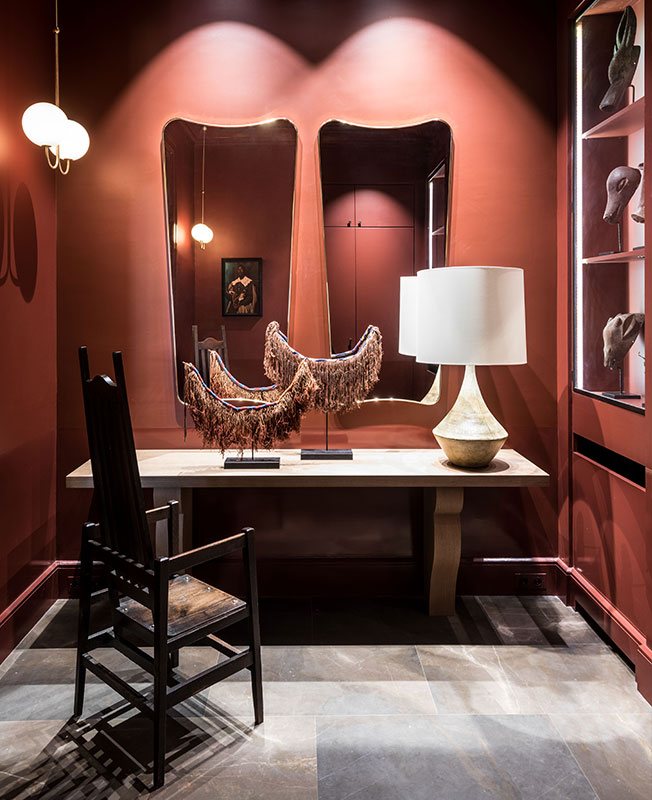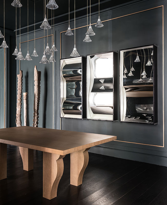 Стол Жан-Мишеля Франка и Адольфа Шано, 1935. Светильник, Mille Nuits, Baccarat. Три зеркала с искривленной поверхностью куплены в галерее Lafon-Vosseler. Лестница африканских аборигенов из галереи Amatuli Johannesburg.