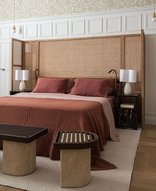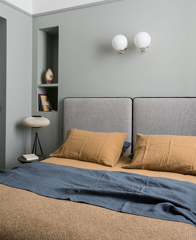 Спальня. Кровать, изголовье и тумбы, диз. Studio Asai. Светильники, диз. Майкл Анастасиадис и Жюльен Барро.