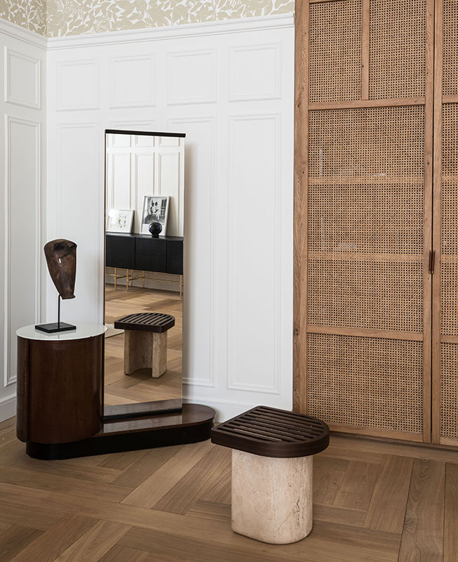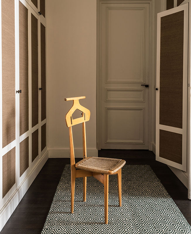 Гардеробная. Стул, диз. Ико Паризи. 1950-е, Fratelli Reguitti. Галерея Deja Vu Design (рынок Paul Bert Serpette). Одежда и обувь спрятаны за дверями, обтянутыми обоями Elitis. Ковер Moodz.