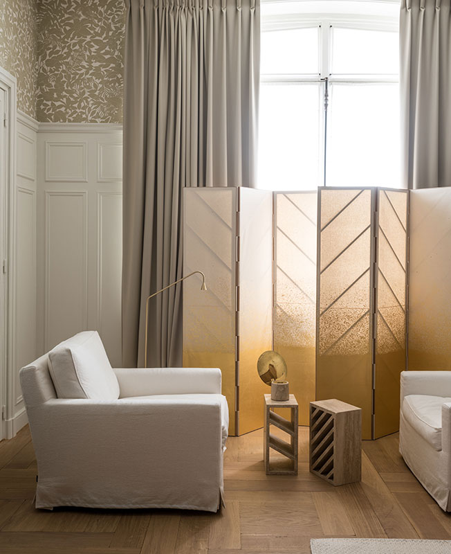 У окна — ширма Kin из бумаги васи, Garnier & Linker. Кресла Cousy, диз. Винсент ван Дейзен, Arfex. Столики Brick Side, диз. Грегуар де Лаффорест. Обои Jungle Life от Hermes.