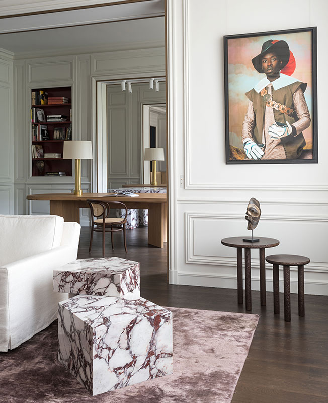 Гостиная. Рядом с диваном Cousy, диз. Винсент Ван Дейзен, Arflex стоит прикроватная тумбочка из мрамора Breccia Medicea, диз. Studio Asai. Столики из ореха Rosae, диз. Goula / Figuera для Collection Particuliere. На стене — фотография Омара Виктора Диопа, Galerie Magnin-A.