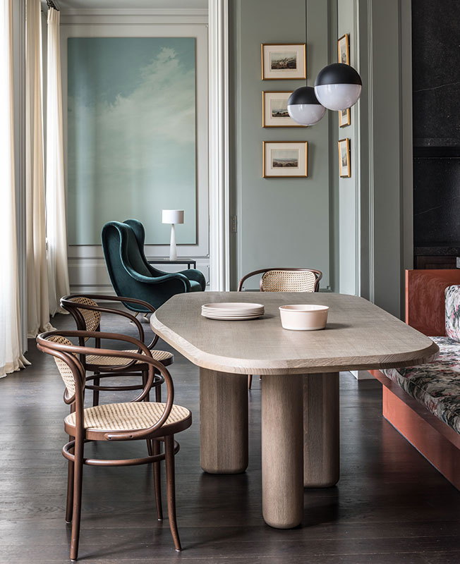 Образец модной эклектики создал в Париже Антуан Симонан, Studio Asai. О своем проекте дизайнер рассказал ИНТЕРЬЕР ДИЗАЙН. Несмотря на то что Антуан Симонан открыл свою студию всего пять лет назад, у него нет недостатка в клиентах. В портфолио отели на Корсике и в Гонконге, ресторан в Ницце, вилла в Греции, шале в Швейцарии, пентхаус в Майами. А также мебель для значимого итальянского бренда Arflex. Кухня. Cтол Rough, диз. Самюэль Аккосберри, Collection Particuliere. Стулья 209, Thonet. Подвесные светильники, диз. Майкл Анастасиадис, Flos. Скамья в ткани Rubelli. Портьеры Dedar. Гостиная. «Облака» — фреска художника Матиаса Кисса. Кресло, диз. Марко Дзанузо. Кухня-столовая. Стены оттенка Pigeon, Farrow