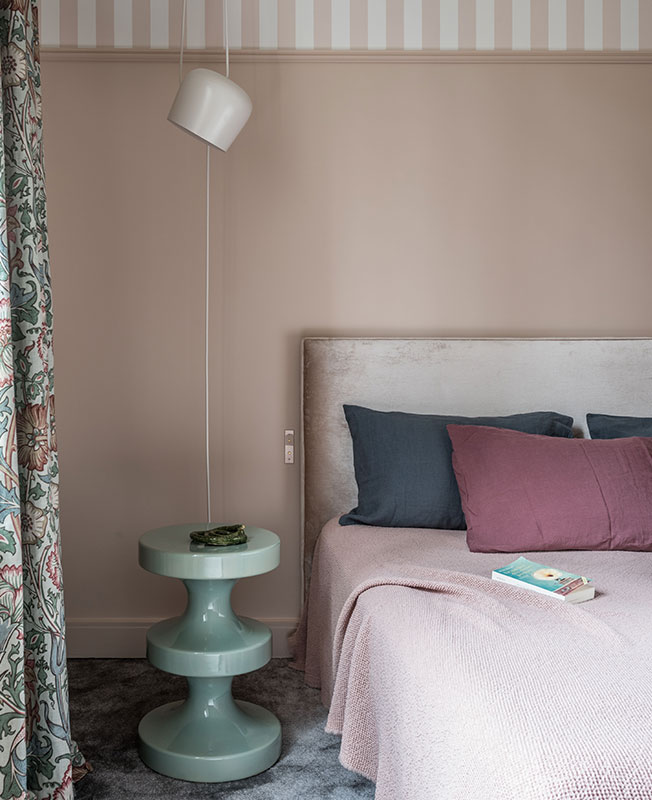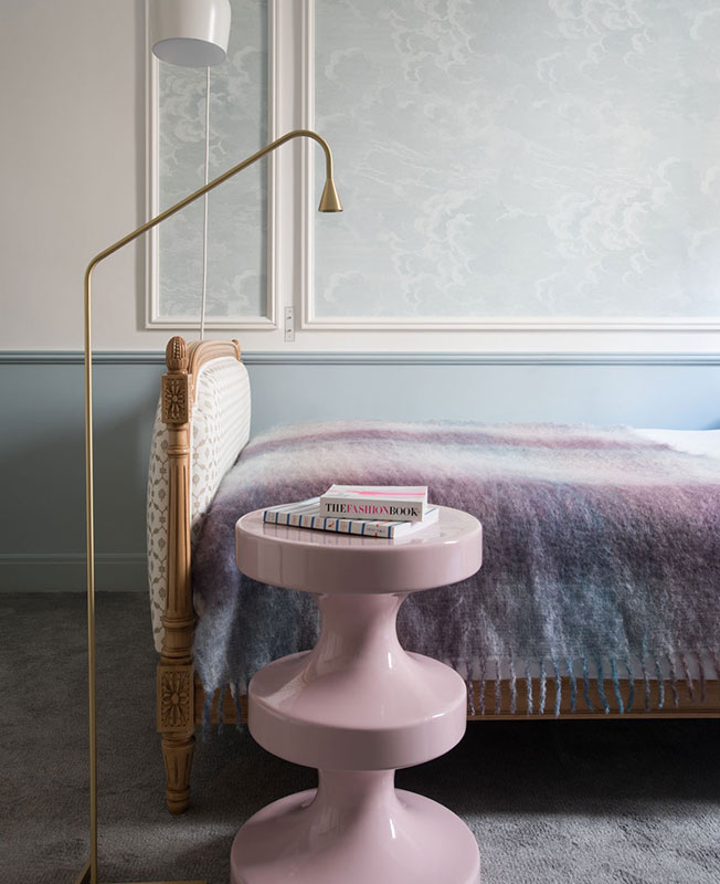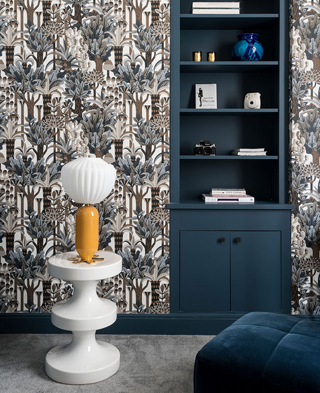 Обои, Hermes. Встроенный шкаф и плинтусы окрашены в оттенок Stifey Blue, Farrow & Ball. Столик Bishop и лампа Don Giovanni, дизайн Индии Мадави.