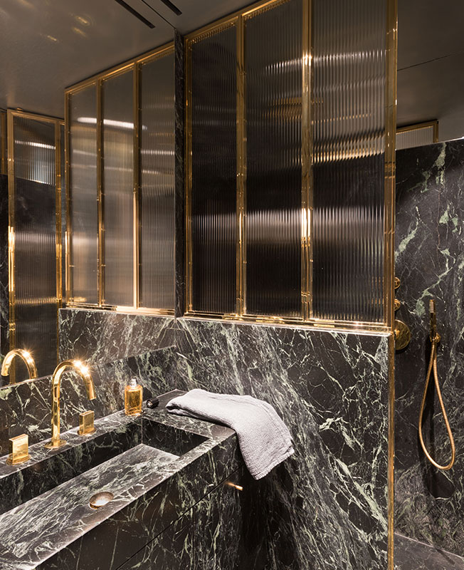 Ванная комната. В отделке использованы черный мрамор и латунь. Рифленая стеклянная перегородка удваивается в почти незаметном зеркале.