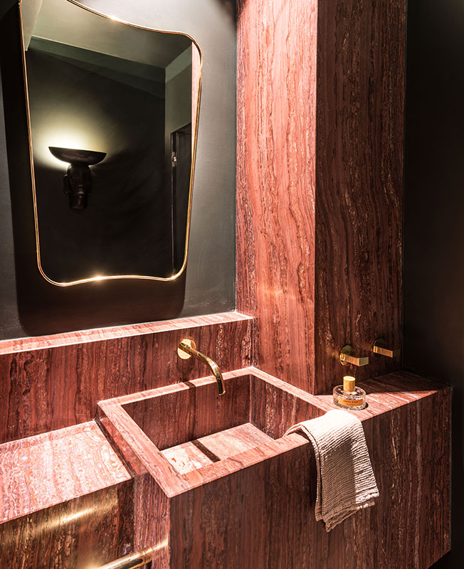 Ванная комната отделана красным бразильским мрамором. Смеситель Fantini. Зеркало, диз. Джо Понти, Gubi. Бра, диз. Карло Скарпа, галерея Lafon-Vosseler.