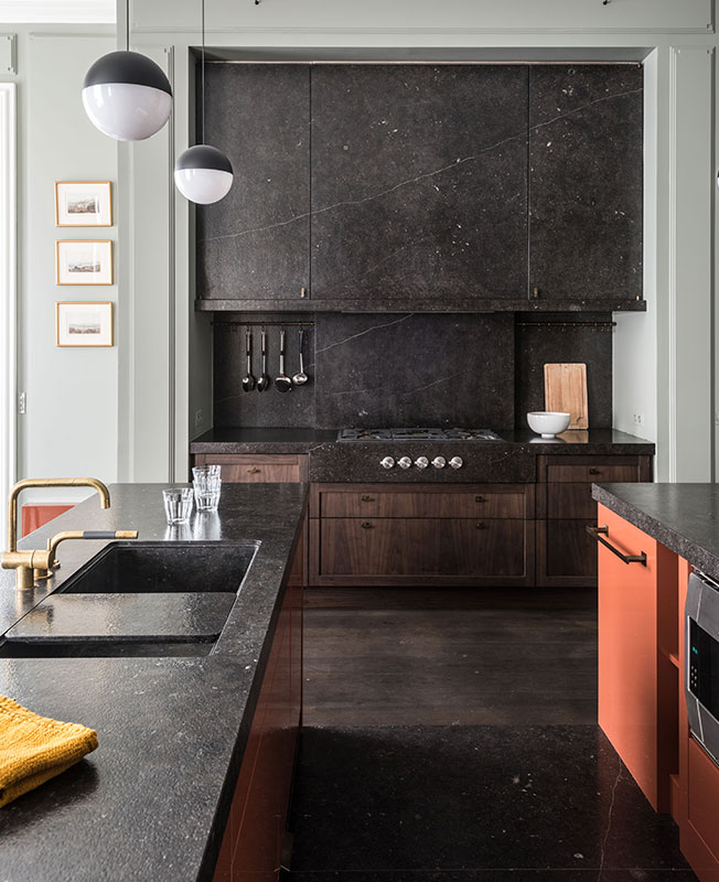 Кухня-столовая. Фасад встроенного в нишу кухонного шкафа истолешницы сделаны из бель-гийского голубого известняка.