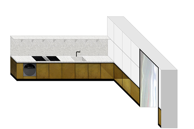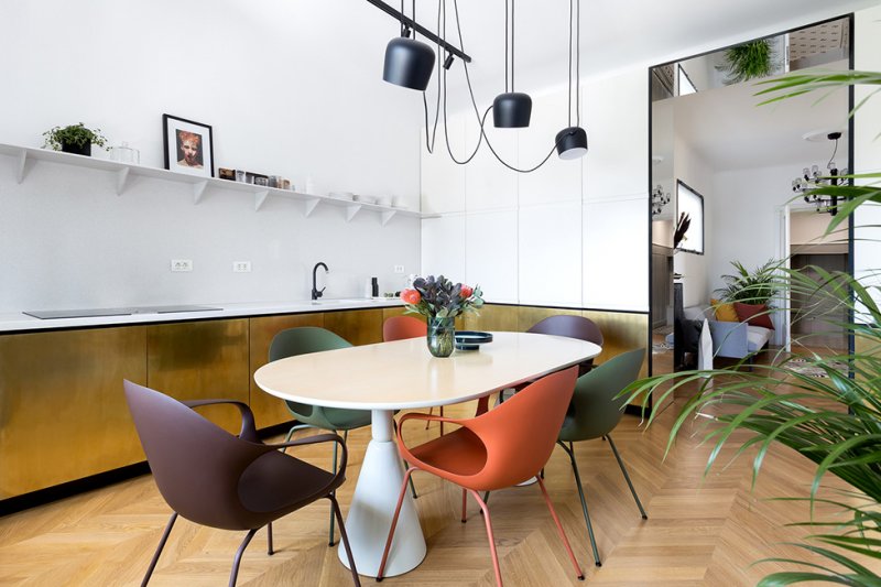 Первоначально план квартиры площадью 100 кв. метров состоял из двух разных зон: репрезентативной дневной и ночной. Новая функциональная планировка стирает дифференциацию между отдельными частями и объединяет в единую схему все пространства, включая основную жилую зону и кухню, важный компонент нашего современного образа жизни и социального взаимодействия.