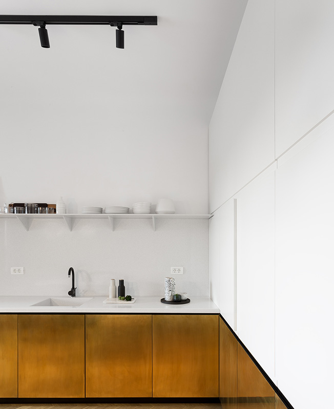 Основная функциональная и эстетическая особенность проекта состоит в связанной последовательности всех пространств и плавном их взаимодействии. Старые, но отремонтированные окна, двери и обогреватели сочетаются с новыми паркетными полами, отделкой мебели, кафелем, латунью и зеркалами.