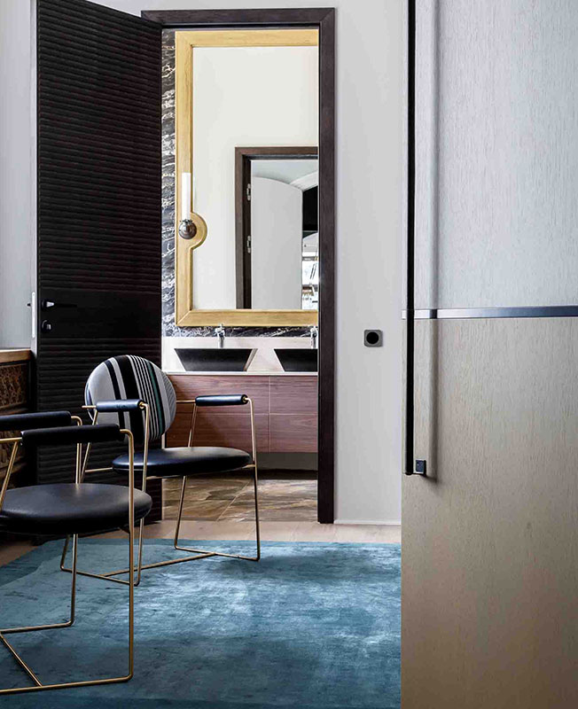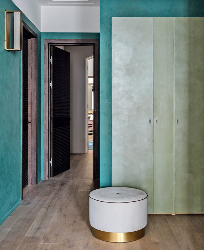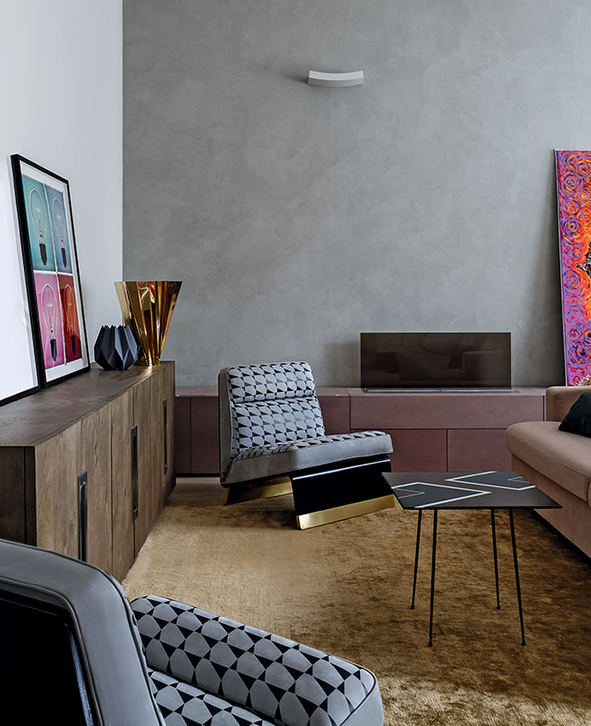 Украшением гостиной стали кресла Baxter — модель Greta дизайн-дуэта Draga & Aurel. Одна стена — акцентная, в отличие от остальных отделана декоративной штукатуркой. Тумбы: индивидуальное изготовление.