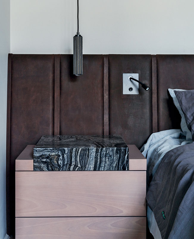 Коммерческий проект предполагает ограниченный бюджет. При этом интерьер должен выглядеть так, чтобы потенциальный покупатель захотел в нем остаться. Поэтому здесь появились авторские предметы: стол, кровать, тумбы, люстра и многое другое разработано Эрманом.