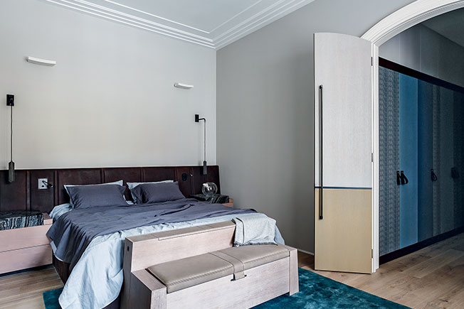Спальня. Кровать, банкетка с интегрированным телевизором, прикроватные тумбы — всё по эскизам автора проекта. Встроенные шкафы обтянуты тканью и дополнены ручками из кожи. Эффектная деталь: двери повторяют форму арочных проемов. Bedroom.