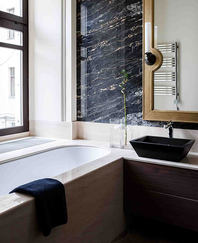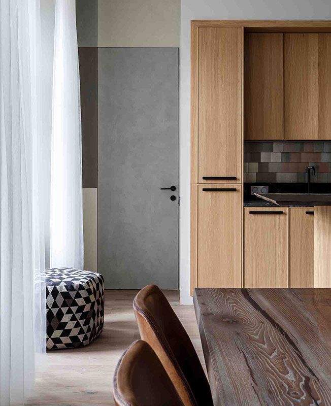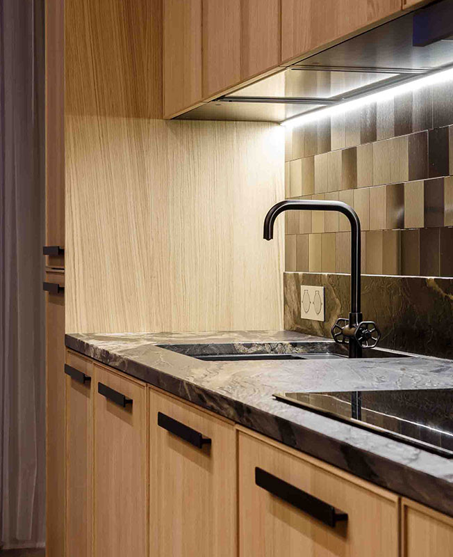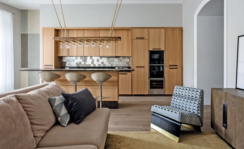«Если придумать оригинальные вещи и в недорогой мастерской изготовить, это выйдет дешевле, чем покупать «бренды». Однако пару кресел Baxter все же поставили: знаковые модели притягивают взгляд. Любопытный ход — доработка готовых вещей. К бюджетной кухне добавили гранитную столешницу и фартук из роскошной алюминиевой плитки, к простым шкафам — ручки из кожи. Не экономили и на розетках с выключателями — дешевые «простят» интерьер.