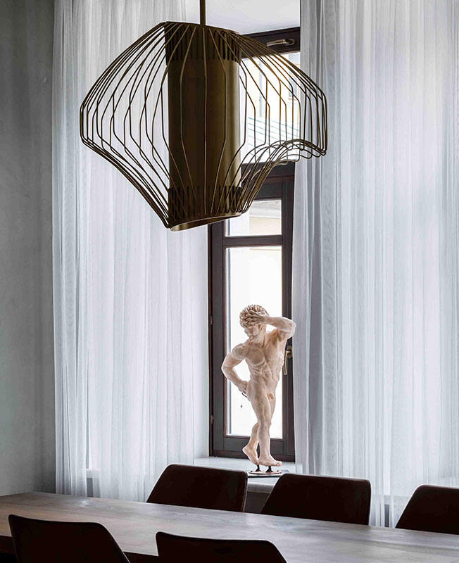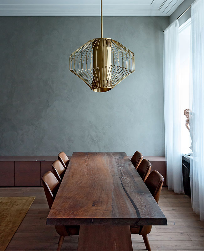 Латунная люстра асимметричной формы — разработка Александра Эрмана. Стол из массива дерева также его дизайна. Монументальная пустая стена в декоративной штукатурке — объединяющий компонент в гостиной. «Мы стремимся минимизировать активные элементы. Это и вопрос экономии в том числе».