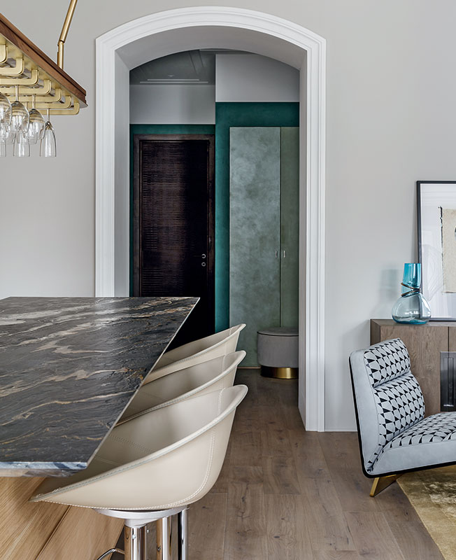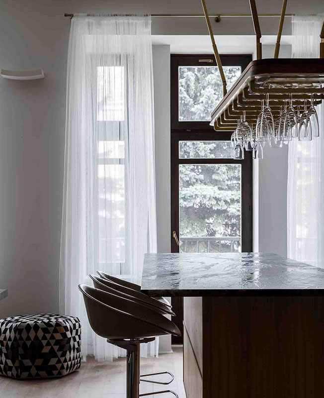 Барная стойка дополнена столешницей из гранита. Стулья Pedrali выбрали за эргономичность и регулируемую высоту. Конструкцию над стойкой (она называется «менсола») спроектировал Александр Эрман: этот предмет он включает в свои проекты на протяжении 15 лет, постоянно модифицируя.