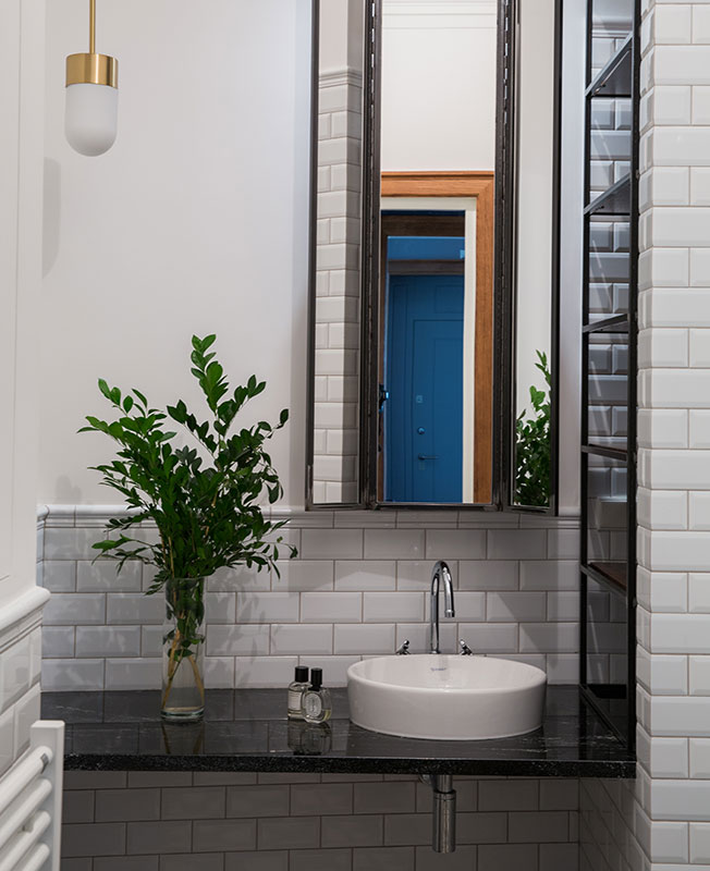 Ванная комната. Светильник, Rubn. Зеркало и стеллаж выполнены на заказ. Раковина, Duravit. Смеситель, Axor. Плитка, APE Ceramica. Столешница из камня, компания Unizaro.