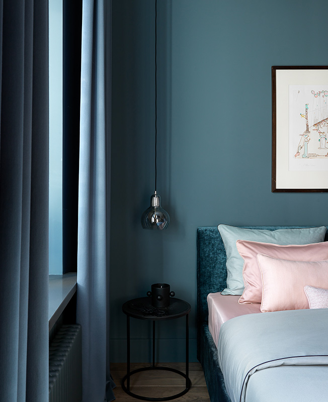 Дизайн предметов нейтрален. Если в чем-то и проявилось смелость, так это в цвете. Впечатляют глубокие краски на стенах. Входная зона, санузел и гардеробная объединены серо-фиолетовым оттенком. Гостиная со спальней — сложнейшим тоном, в котором есть и синева, и бирюза, и зелень. «В последнее время почти во всех своих проектах я применяю краски французского бренда Argile. Беспроигрышный вариант: никаких выкрасов делать не надо», — делится опытом Татьяна.