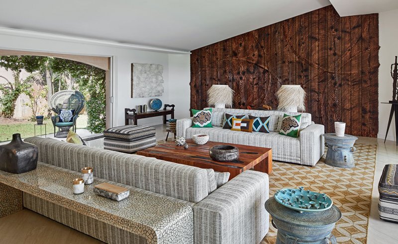 Гостиная. Стена украшена деревянной резной панелью, которую выполнил скульптор Этьенн Мойа. Диваны SC Edition. Консоль в отделке из яичной скорлупы. Столик в центре и декор, дизайн Шахана Минассяна, Chahan Gallery. Лампы с пальмовым волокном: Rock the Kasbah. В углу скульптура из бронзы: Альбер Феро, 1956. На переднем плане тайский барабан в роли столика.