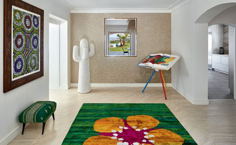 Входной холл. «Кактус» — вешалка Gufram, диз. Гидо Дрокко и Франко Мелло. Ковер дизайна Стефани Кута изготовлен компанией Staron: индийский растительный шелк, окрашенный натуральными пигментами. На подставке альбом Дэвида Хокни издательства Taschen.