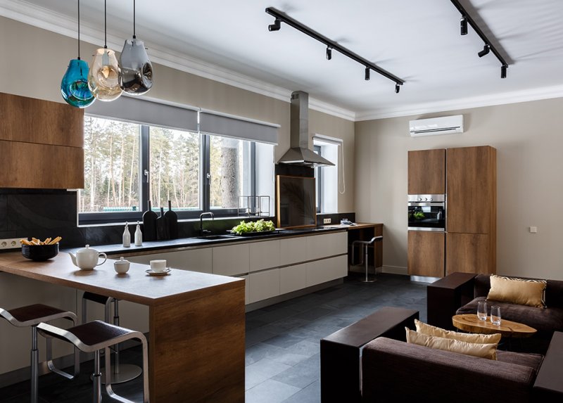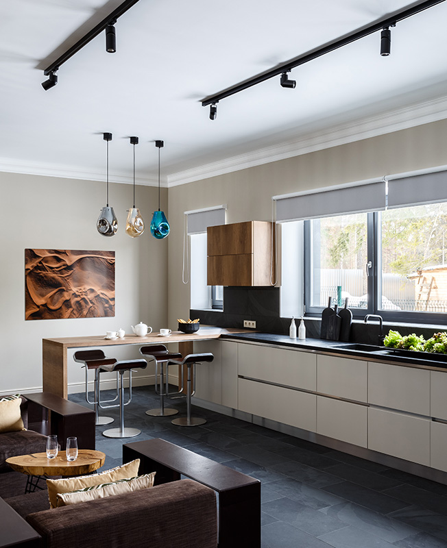 Лестница из бетона, обшитая деревом, с ограждениями из черного металла — стержень дома. Проект Елены Андреевой, руководителя студии WellDesign — дом по Успенскому шоссе: полностью укомплектованный, готовый для жизни. Автор рассказывает об особенностях работы над коммерческим объектом. Честно говоря, я не сразу согласилась участвовать в этом проекте. Меня серьезно смущал тот факт, что нужно работать для виртуального заказчика. Но так как я человек азартный и любознательный, то профессионализм взял вверх. И тогда я придумала легенду о семье, которая будет здесь жить: родители и трое детей разного возраста и пола, каждый со своим характером. У меня даже были психологические портреты каждого члена семьи. Первый этаж — объединенное пространство с условными границами зон. На стенах сложный серо-бежевый оттенок. Обеденный стол изготовлен на заказ из слэба дуба шириной 115 см и толщиной 6 см, мастерская MagicWood. Шторы на электроприводе закрепены за карнизом. Двери WhiteInterior. Диван, витрины, стулья Dantone Home. Мебельные модули Stosa Cucine размещены только по нижней линии. «Я хотела сделать максимально легкую кухню, не превращать ее в цех для готовки», — говорит Елена Андреева. Здесь же зона отдыха с креслами Flexform. Столик: мастерская The Sarai. Полубарные стулья Lema. . В проекте я принимала участие с нуля. Вместе с архитектором работала над планировкой, с момента закладки фундамента до расстановки аксессуаров проводила авторский надзор. Полное доверие инвестора оправдало себя. Основная идея проекта — загородный дом для жизни с комфортом. Важно то, что внутри, а не то, что снаружи. Площадь вместе с террасами составляет 630 кв. метров, теплого контура — 530 кв. метров. nonenonehttps://www.facebook.com/profile.php?id=100000308466767 https://www.instagram.com/welldesignstudio/https://www.facebook.com/profile.php?id=100000308466767 https://www.instagram.com/welldesignstudio/http://www.well-design.ru/ Кухня Stosa Cucine. Кресла Flexform. Полубарные стулья Lema. На стене работа аэрофотографа Стаса Бартникаса: дюны пустыни Намиб. Особенность работы над таким проектом — полная свобода действий и ограниченный бюджет. Это те новые условия работы, с которыми все чаще приходится сталкиваться. Моя концепция построена на трех компонентах. Первый — эргономика. Второй — экологически чистые материалы: дерево, бразильский сланец, камень, металл, стекло. Третье — ароматы: в каждой зоне расположены диффузоры со своим неповторимым запахом. Бразильский сланец с фасада перешел в интерьер и занял значительную часть пола первого этажа. Перегородка из ламелей MagicWood. Первый этаж представляет собой единое пространство с условным делением. Гостиная-столовая с камином, просторная кухня, входная группа с большим гардеробом. Кабинет с функцией кинотеатра и спа-зона отделены большой откатной перегородкой. На втором этаже четыре спальни. При каждой — своя открытая гардеробная и санузел. Две спальни имеют выход на открытую террасу. Кабинет с функцией домашнего кинотеатра — единственная уединенная комната на первом этаже. Диван Flexform. Cтол и стеллаж Smania. Стул Mascheroni. В отделке стен сочетаются краска Derufa и обои бренда Aura, коллекция Handsome. Ковер Dovlet House. Пледы, подушки: Галина Лугина. Отделочные материалы выбирались с учетом современных тенденций, практичности и, конечно, моих пристрастий. Межкомнатные двери в натуральном шпоне дуба — удачная находка как по стоимости, так и по эффектности. Бразильский сланец с фасада