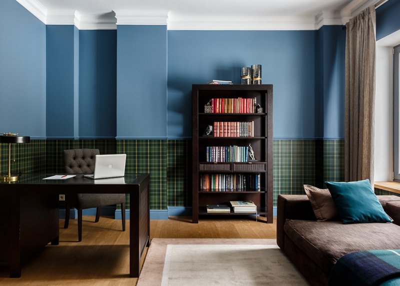 Кабинет с функцией домашнего кинотеатра — единственная уединенная комната на первом этаже. Диван Flexform. Cтол и стеллаж Smania. Стул Mascheroni. В отделке стен сочетаются краска Derufa и обои бренда Aura, коллекция Handsome. Ковер Dovlet House. Пледы, подушки: Галина Лугина.