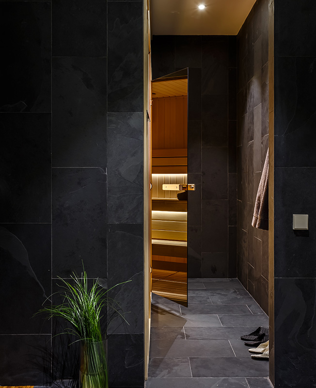 Спа-зона. Стены и пол отделаны бразильским сланцем.