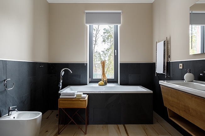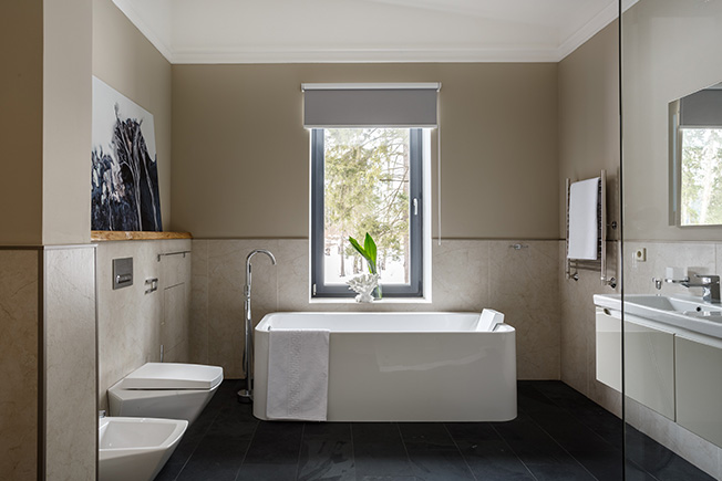 Одна из ванных комнат. Керамогранит Italon. Отделка стен плитами высотой 1,2 метра позволила избежать обилия стыков. На полу сланец. Все ванны в доме установлены у окна, чтобы во время водных процедур созерцать природу. Оснащение Roca, Toto, Simas, Hansgrohe, Kolpa San куплено на выставке Мосбилд 2018.