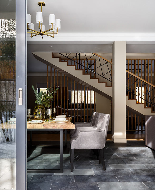 Первый этаж — объединенное пространство с условными границами зон. На стенах сложный серо-бежевый оттенок. Обеденный стол изготовлен на заказ из слэба дуба шириной 115 см и толщиной 6 см, мастерская MagicWood. Шторы на электроприводе закрепены за карнизом. Двери WhiteInterior. Диван, витрины, стулья Dantone Home.
