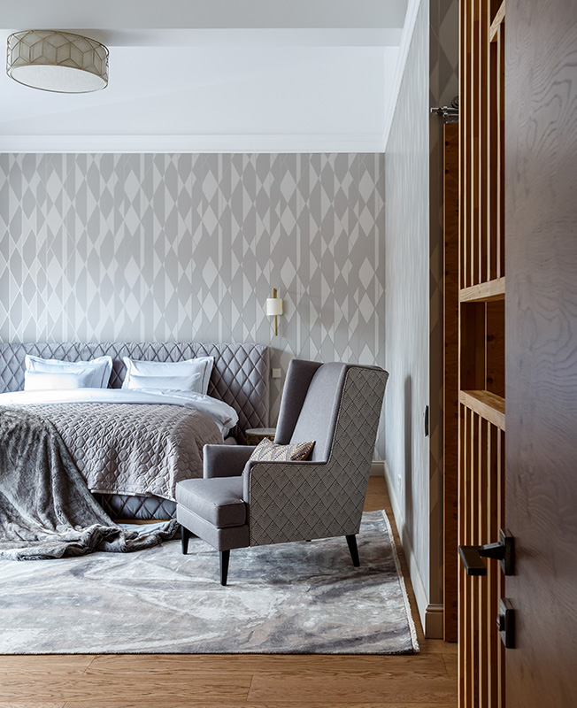 Главная спальня. Обои Cole & Son. Мебель Altrenotti. Кровати, матрасы и постельное белье — все было заказано по специальной цене на миланской выставке Isaloni 2018. Меховое покрывало: Галина Лугина. Cтолярные изделия: Magic Wood
