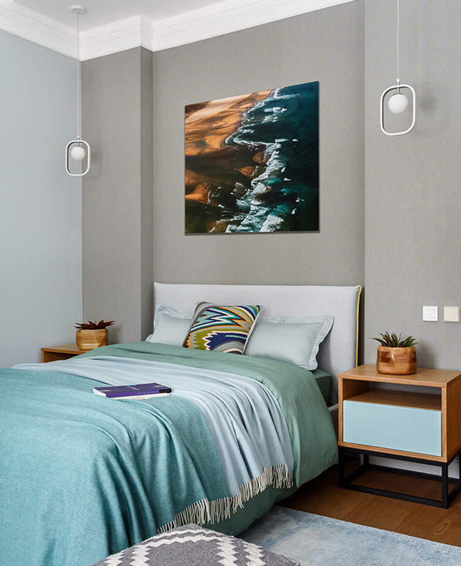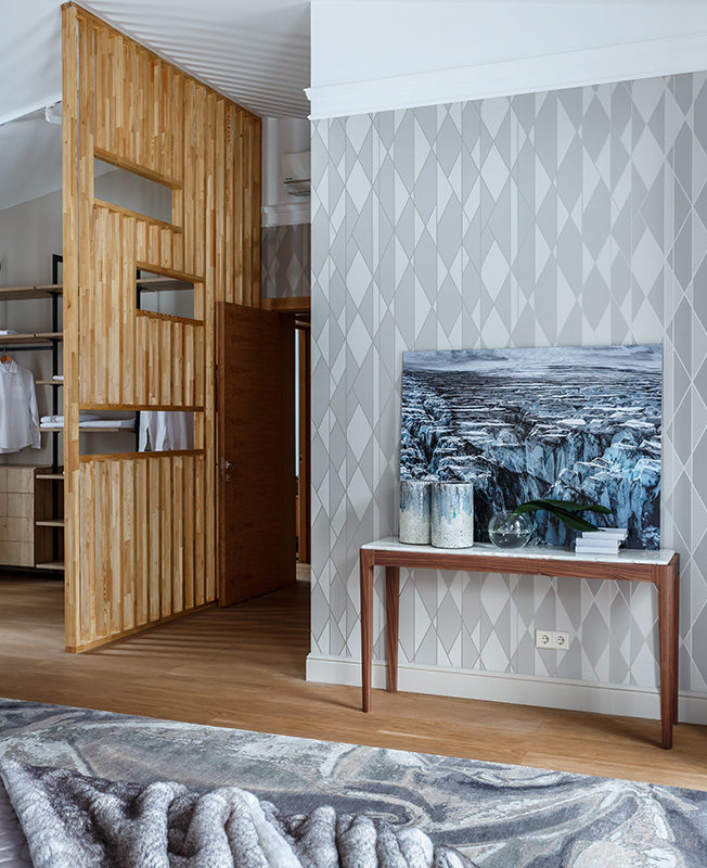Все гардеробные — без дверей, являются частью пространства спален. «Я не люблю ставить двери там, где можно обойтись без них. Это пришлось кстати: таким образом мы сократили бюджет», — говорит Елена Андреева. Работа аэрофотографа Стаса Бартникаса изображает исландские льды (победитель конкурса WIFA 2017).