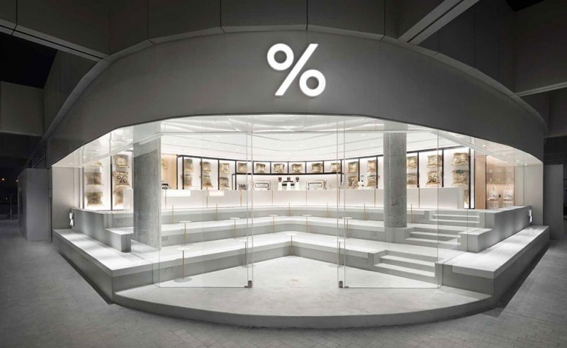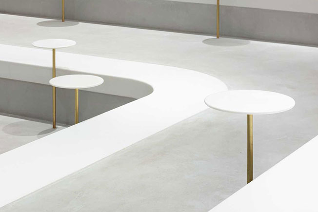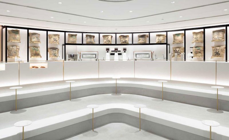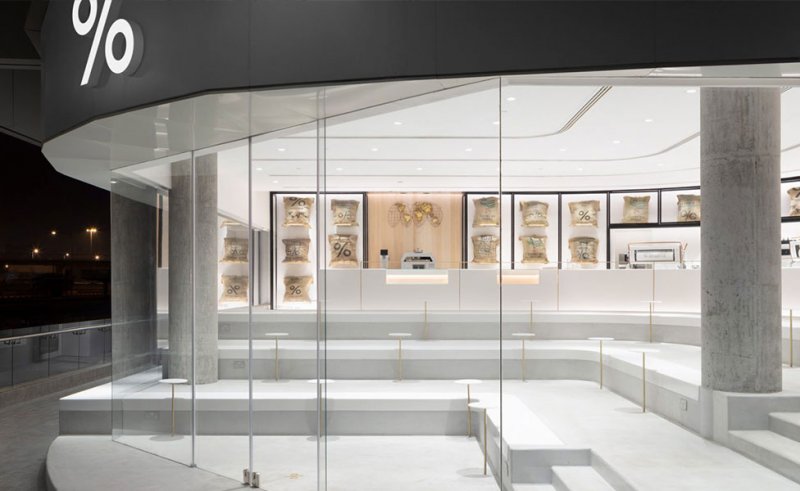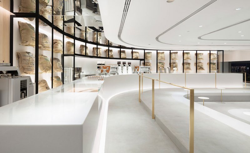 Японский дизайн на Ближнем Востоке. В Кувейте открылась белоснежная кофейня по проекту Оки Сато и японской студии Nendo. Кафе-бар площадью 190 кв. метров занимает угловое здание с изогнутым стеклянным фасадом. Внутри светлый интерьер со ступенчатыми бетонными сидениями и латунными светильниками. Ступени ведут к дальней стене пространства, где расположена полукруглая барная стойка и стенд с разными сортами кофе — в льняных мешках кофе высшего сорта из Хигасиямы, Япония. Из-за ограниченной высоты площадки, сидения были разделены на уровни, что напоминает классический амфитеатр. Открытая планировка пространства и отсутствие стульев создают больше возможностей для передвижения для клиентов и бариста.
