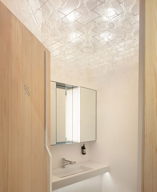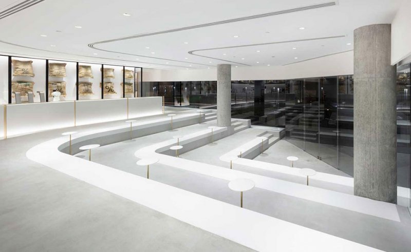 Кафе-бар площадью 190 кв. метров занимает угловое здание с изогнутым стеклянным фасадом. Внутри светлый интерьер со ступенчатыми бетонными сидениями и латунными светильниками. Ступени ведут к дальней стене пространства, где расположена полукруглая барная стойка и стенд с разными сортами кофе — в льняных мешках кофе высшего сорта из Хигасиямы, Япония.