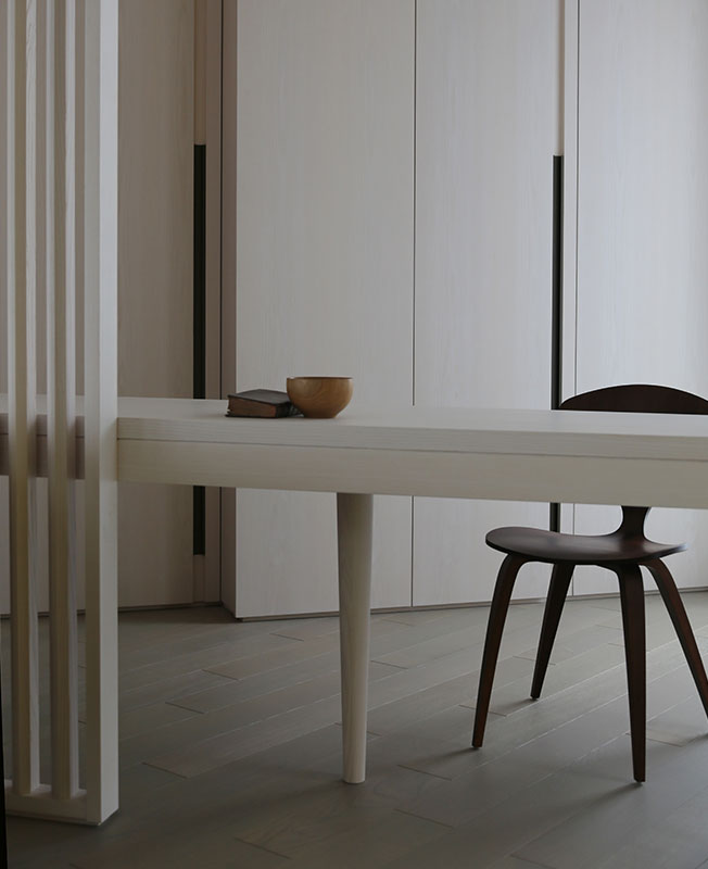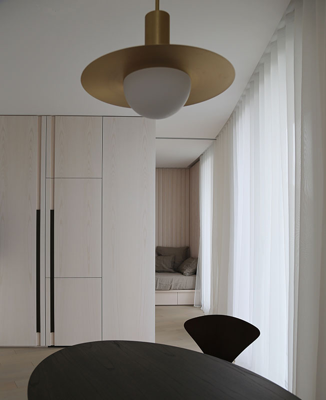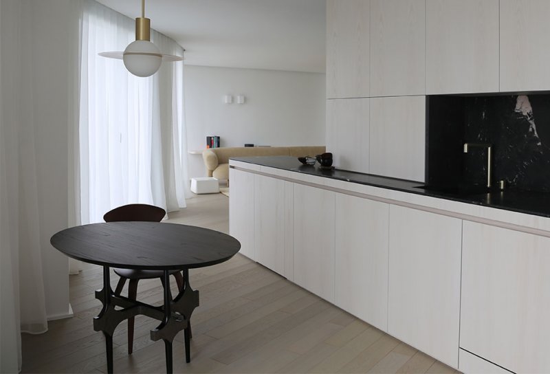 Заказчики просили минимум предметов — их просьбу мы с удовольствием выполнили. Мебель в основном встроенная, в отделке из беленого ясеня. На полу дуб, в кухне — бразильский гранит. Стены словно обтянуты вуалью. Всё подчинено идее теплого белого света. Для меня такое текучее, транспарентное, светлое пространство, наполненное свободно циркулирующим воздухом, является образцом современной роскоши.