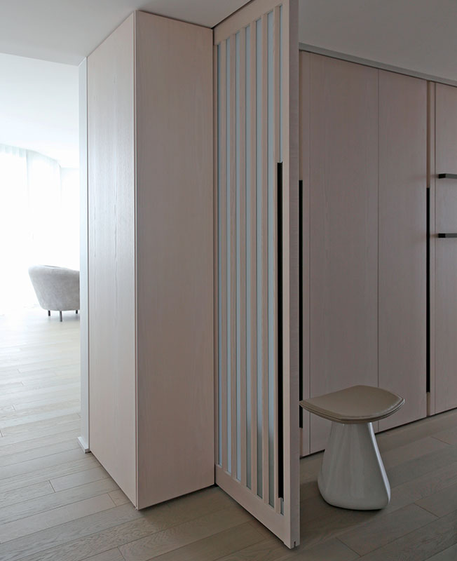 Разнообразные гардеробные, ящики, раздвижные двери, полки — целые серии устройств формируют нашу «машину для жилья» и делают ее работоспособной. Сегодня предметы можно выбирать для удовольствия, а не под давлением необходимости. Мы с Кристофом стараемся тонко соединять превосходный уровень экипировки интерьера с акцентами галерейного дизайна».