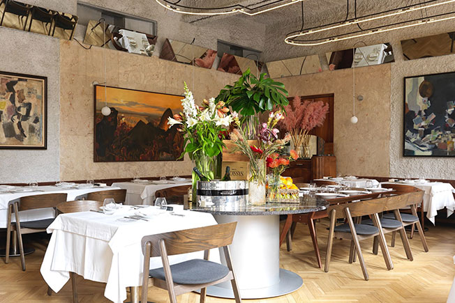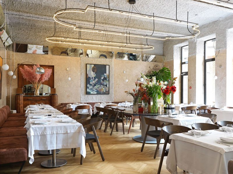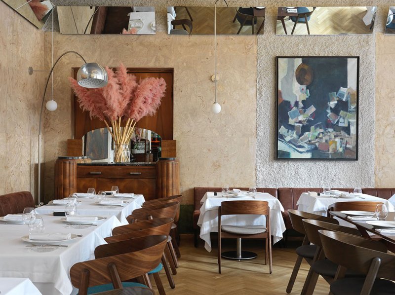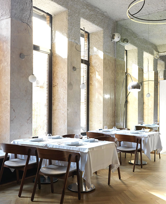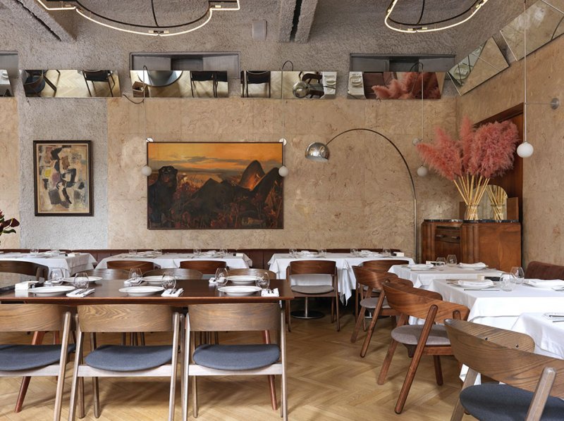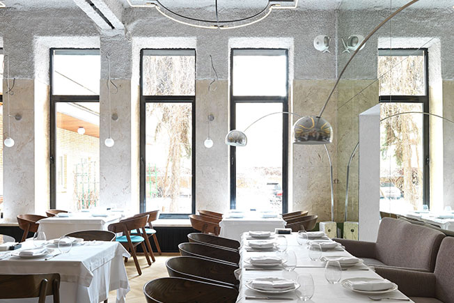 Относительно небольшое пространство ресторана площадью 120 кв. метров визуально расширили за счет зеркал, а открытые витражные окна привнесли в помещение воздух. Дизайн-концепция направлена на создание спокойной и непринужденной атмосферы вне времени. Интерьер получился простым и самодостаточным, Тамара Муратова и Аскар Рамазанов старались подойти к процессу трансформации помещения очень деликатно, свести авторское присутствие к минимуму.