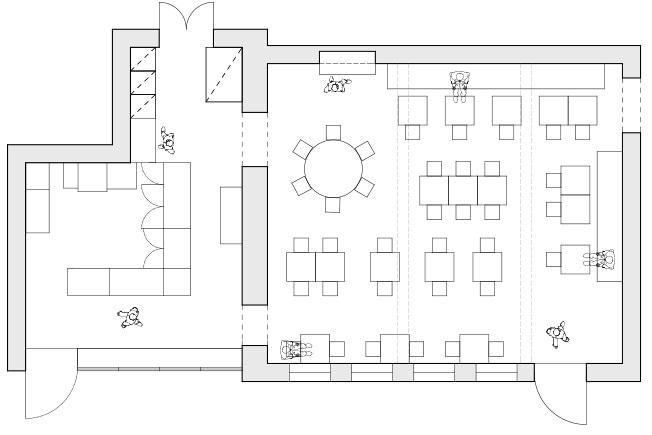 Все основные элементы интерьера были выполнены по эскизам архитекторов: настенные и потолочные светильники, стойка кассы, центральный круглый стол, конструкции открытой кухни.