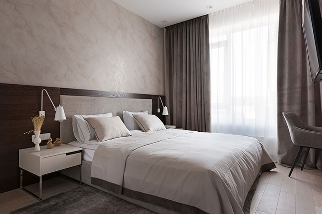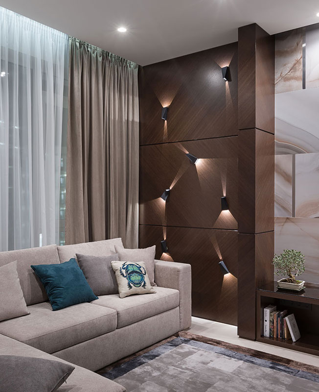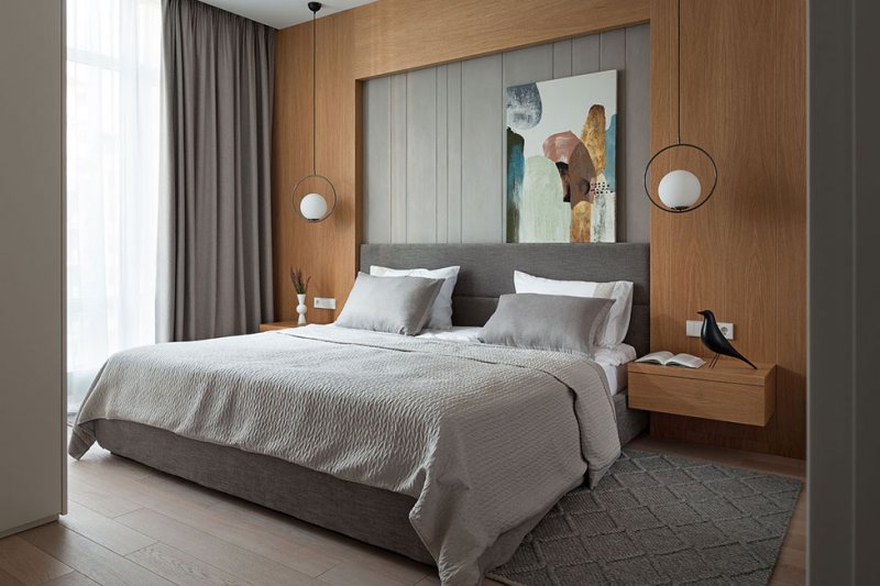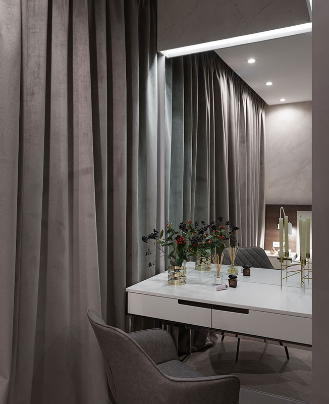 Отдельное внимание авторы проекта уделили декору окна: тяжелые шторы вечером сменяются проницаемыми для солнца легкими тканями днем. В сочетании с теплыми оттенками, натуральной отделкой, текстиль также вносит в пространство ощущение домашнего уюта, создает ощущение защищенности.