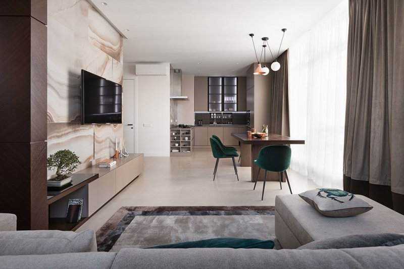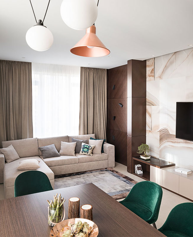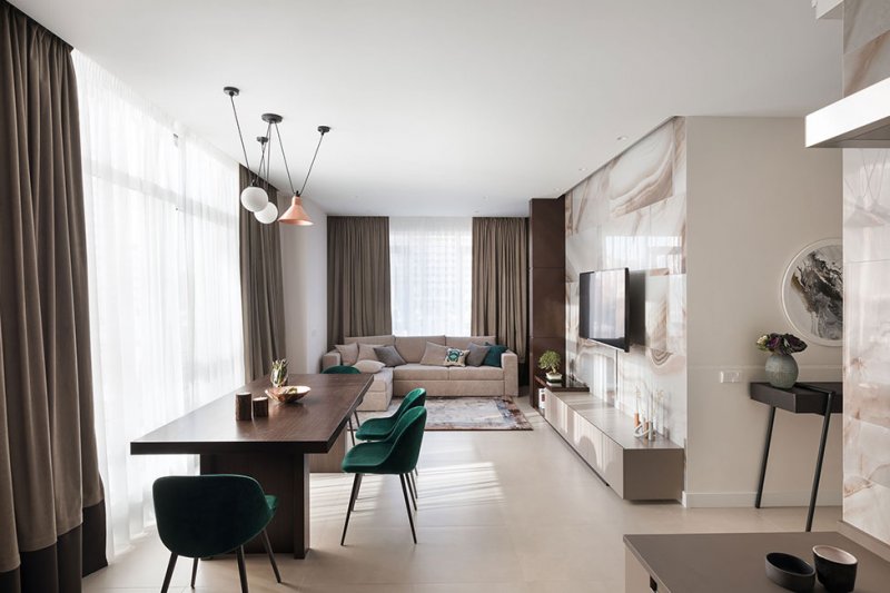 Киевская квартира 83 кв. метра не предназначалась для постоянного проживания. Заказчики, молодая семейная пара, хотели получить пространство выходного дня, куда можно приехать с друзьями или родными, устроить праздничный обед, сесть за большой стол и проговорить до утра. Вести проект пригласили студию V.Concept. Дизайнеры сразу решили, что интерьер должен быть максимально уютным, легким, не давящим на хозяев и гостей. В основу концепции легла функциональность. По желанию заказчиков, в квартире выделили две полноценные спальни, каждая со своим санузлом, и очень просторную общую зону с гостиной, столовой и кухней, в которой всегда много света и воздуха. В отделке использовали преимущественно натуральные материалы, а в цветовой гамме остановились на мягком пастельном градиенте и акцентном зеленом в текстиле обеденных стульев, узоре декоративных подушек и редком комнатном растении. Кажется, что в интерьере дизайнеры также использовали все оттенки натуральной древесины — от лаконичного бежевого до насыщенного коричневого. Отдельное внимание авторы проекта уделили декору окна: тяжелые шторы вечером сменяются проницаемыми для солнца легкими тканями днем. В сочетании с теплыми оттенками, натуральной отделкой, текстиль также вносит в пространство ощущение домашнего уюта, создает ощущение защищенности. nonehttps://www.instagram.com/v_concept_studio/https://www.facebook.com/profile.php?id=100005219530306http://www.v-vitkovskaya.com/ nonehttps://www.instagram.com/v_concept_studio/https://www.facebook.com/nastia.sokolovaahttp://www.v-vitkovskaya.com/ nonenonehttps://www.facebook.com/anet.gnatenkohttp://www.v-vitkovskaya.com/